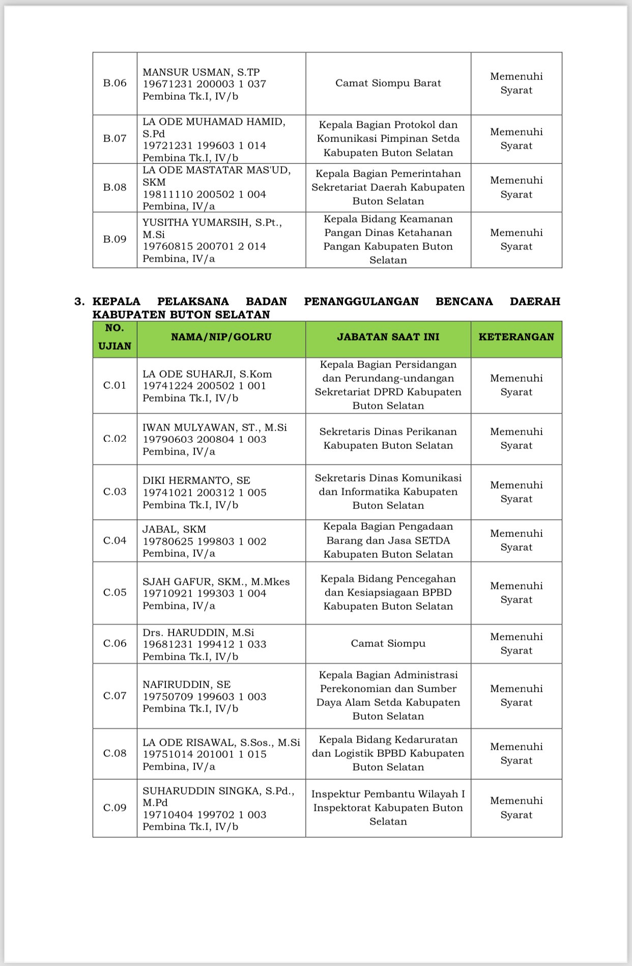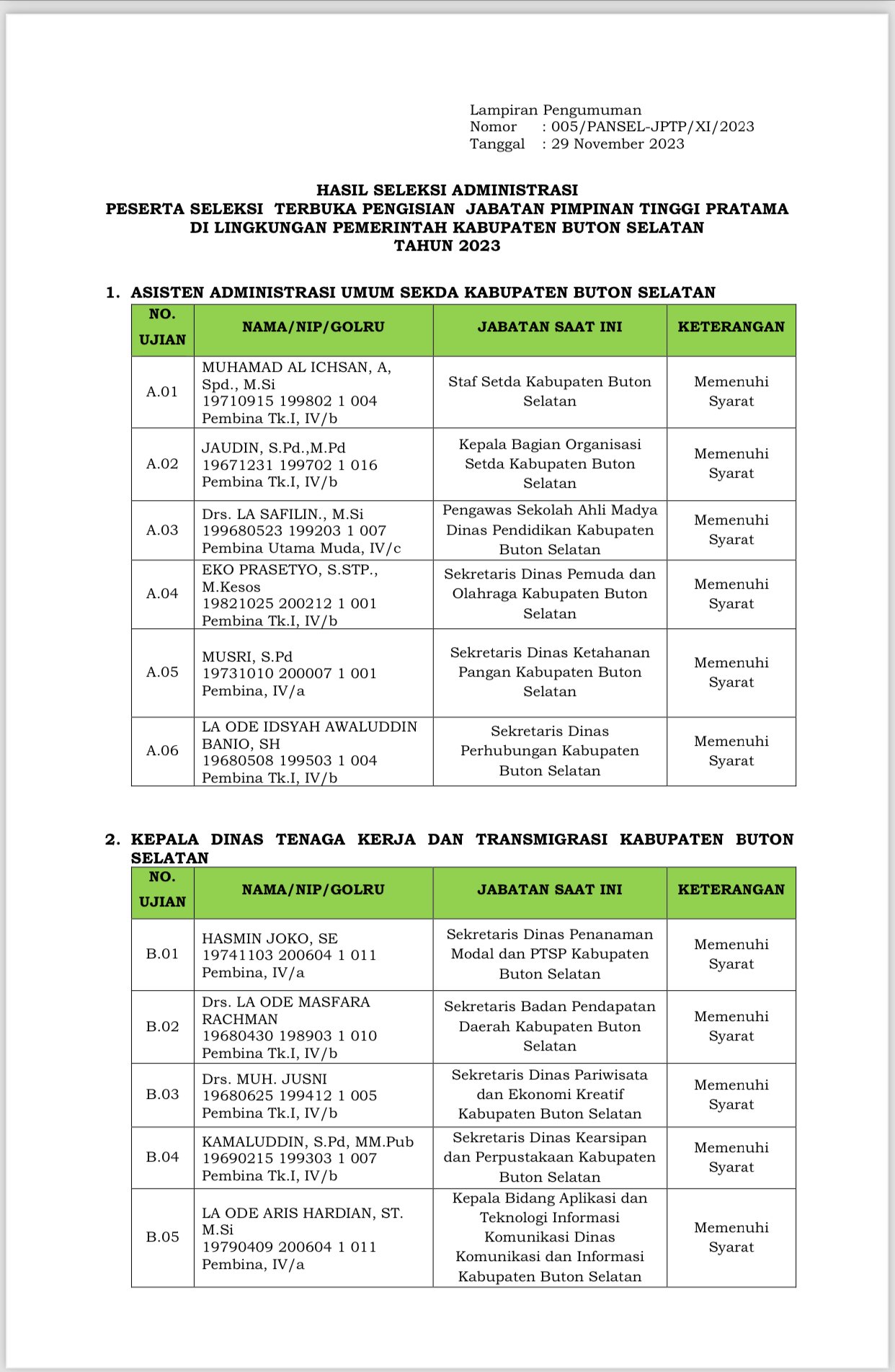 BUSEL, SEGEMENSULTRA.COM – Panitia Seleksi Terbuka Pengisian Jabatan Pimpinan Tinggi Pratama Kabupaten Buton Selatan (Busel) secara resmi mengumumkan hasil seleksi administrasi yang dilaksanakan pada tahun 2023. Berdasarkan Berita Acara Pemeriksaan Berkas Administrasi Nomor 850/003/PANSEL-JPTP/XI/2023, sejumlah 40 peserta berhasil lolos seleksi administrasi.