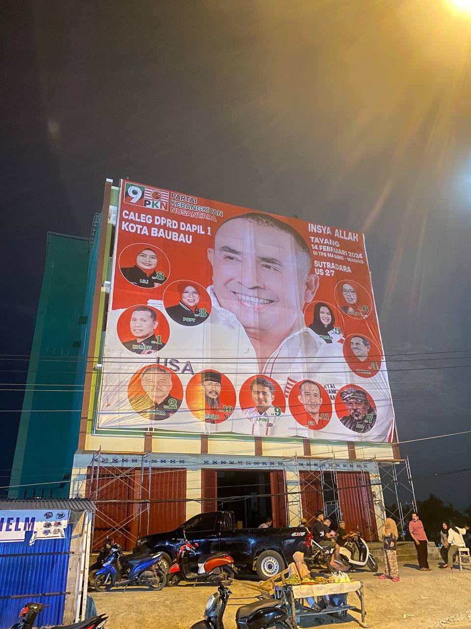 Baliho spektakuler ini menampilkan wajah 11 Calon Anggota DPRD Kota Baubau Dapil 1 dari PKN, dengan menampilkan masing masing nama panggilan dan nomor urut antara lain Kumbu (No. 1), Natsir (No. 2), Popy (No. 3), Hamuri (No. 4), Kamla (No. 5), Nuriana (No. 6), Aba (No. 7), Lili (No. 8), Aping (No. 9), Triad (No. 10), dan Fin (No. 11).
