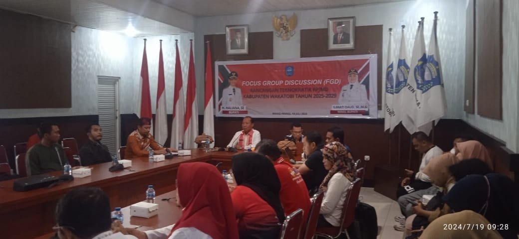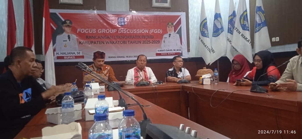WAKATOBI, SEGMENSULTRA. COM – Pemerintah Daerah (Pemda) Kabupaten Wakatobi melalui Badan Perencanaan, Penelitian dan Pembangunan (Bappeda) menggelar Focus Group Discussion (FGD) tentang rancangan teknokratik RPJMD Kabupaten Wakatobi tahun 2025-2029 , Jum’at 19 Juli 2024 dilantai II sekretariat Daerah kabupaten Wakatobi.