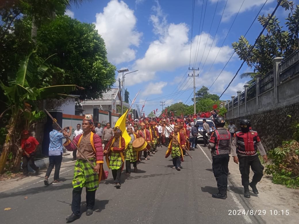 WAKATOBI, SEGMENSULTRA.COM – Pasangan Calon ( Paslon) Bupati dan Wakil Bupati H Haliana dan Hj Safia Wualo dengan akronim Bersama Haliana Safia Wualo ( BERHASIL) diantar oleh pasukan tamburu Liya untuk mendaftar di KPUD Wakatobi, Kamis, 29 Agustus 2024. Selain Tamburu Liya, partai koalisi dan partai Pendukung ribuan simpatisan juga ikut , bahkan Paslon Berhasil tersebut di giring dengan menaiki Ojek,