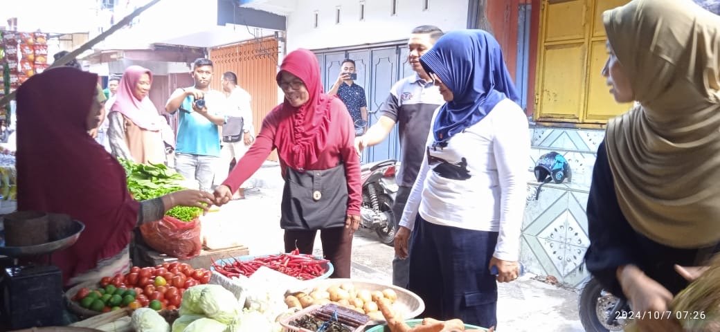 Dalam kunjungan ke pasar Hj Safia Wualo berinteraksi langsung dengan para pedagang pasar pagi, salah satunya penataan tempat jualan yang ada di seputaran pasar.