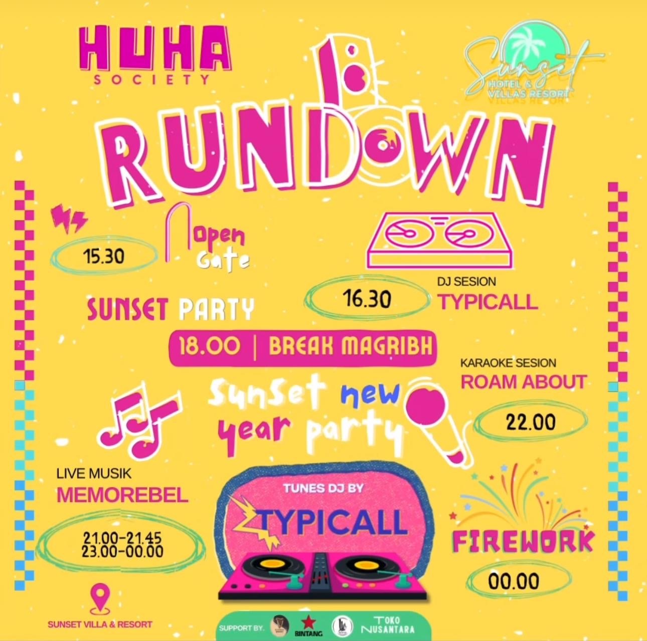“HUHA”, yang mengusung konsep hiburan modern, menargetkan anak-anak muda yang ingin merayakan tahun baru dengan gaya berbeda. Pemandangan laut yang indah, angin sejuk, serta atmosfer eksklusif Sunset Hotel & Villas Resort membuat lokasi ini menjadi pilihan sempurna untuk berpesta hingga malam pergantian tahun.
