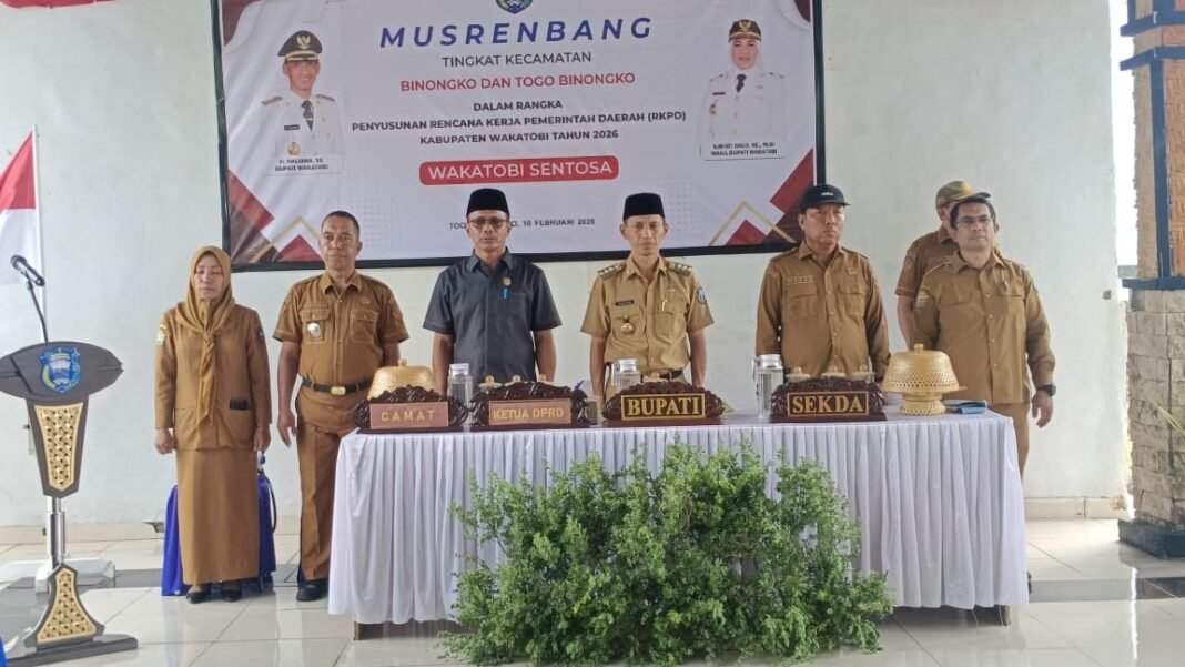 WAKATOBI, SEGMENSULTRA.COM – Pemerintah Kabupaten Wakatobi menggelar Musyawarah Perencanaan Pembangunan (Musrenbang) perdana untuk anggaran tahun 2026 di Pulau Binongko. Acara ini dibuka langsung oleh Bupati Wakatobi, H. Haliana, di Aula Kecamatan Togo Binongko pada Senin, 10 Februari 2025.