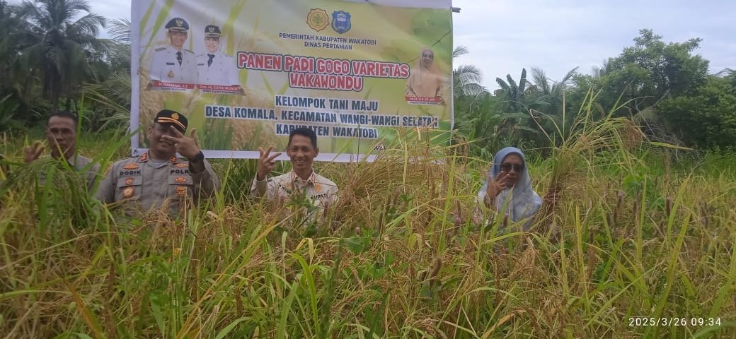WAKATOBI, SEGMENSULTRA.COM – Pemerintah Kabupaten (Pemkab) Wakatobi melalui Dinas Pertanian menggelar panen padi gogo varietas Wakawondu di Desa Komala, Kecamatan Wangi-Wangi Selatan, pada Rabu, 26 Maret 2024.