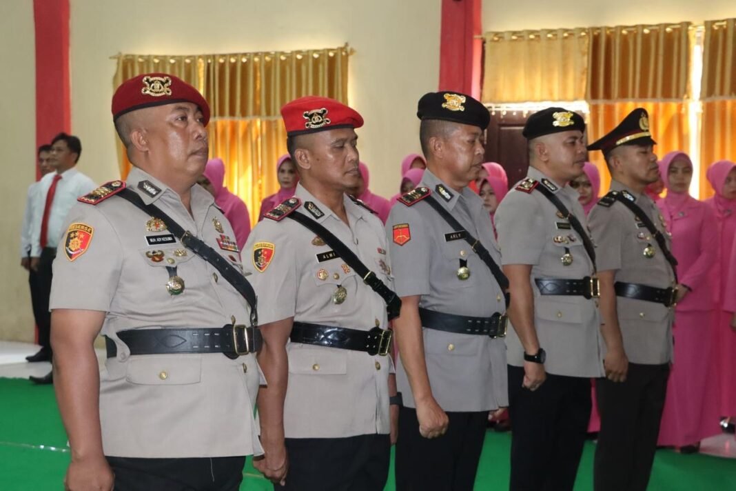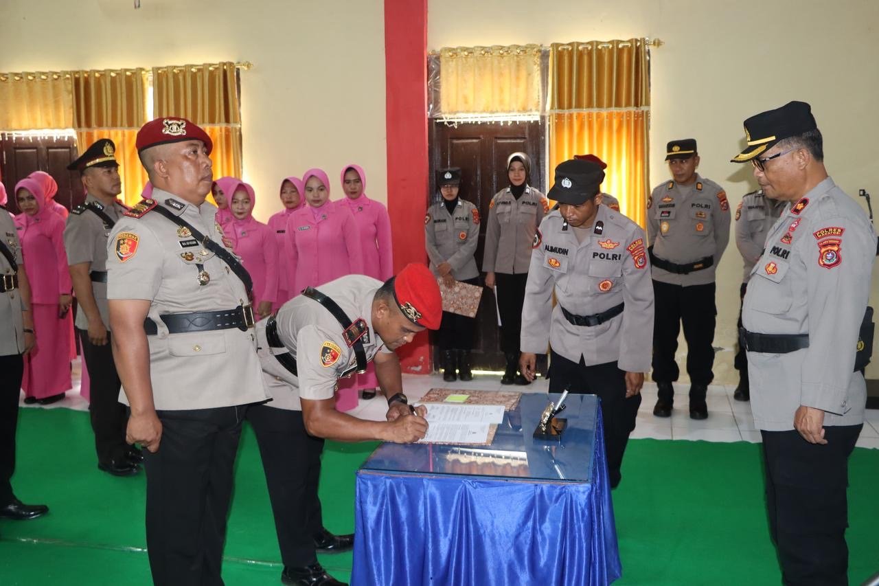 Upacara Sertijab berlangsung khidmat dan dihadiri oleh para pejabat utama Polres, kapolsek jajaran, perwira, personel Polres Wakatobi, serta pengurus Bhayangkari.