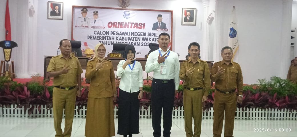 WAKATOBI, SEGMENSULTRA.COM – Bupati Wakatobi, Haliana, memberikan arahan penting kepada peserta orientasi Calon Aparatur Sipil Negara (ASN) lingkup Pemerintah Kabupaten Wakatobi. Kegiatan ini digelar di Aula Gedung Wanita, Kecamatan Wangi-Wangi, Senin, 16 Juni 2025.
