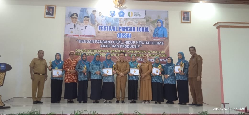 WAKATOBI, SEGMENSULTRA.COM — Pemerintah Daerah Kabupaten Wakatobi melalui Dinas Ketahanan Pangan bekerja sama dengan Tim Penggerak Pembinaan Kesejahteraan Keluarga (PKK) menggelar Festival Pangan Lokal Beragam, Bergizi, Seimbang, dan Aman (B2SA) tingkat kecamatan se Kabupaten Wakatobi. Kegiatan ini berlangsung di Aula Vila Nadila, Kecamatan Wangi-Wangi, pada Senin, 16 Juni 2025.