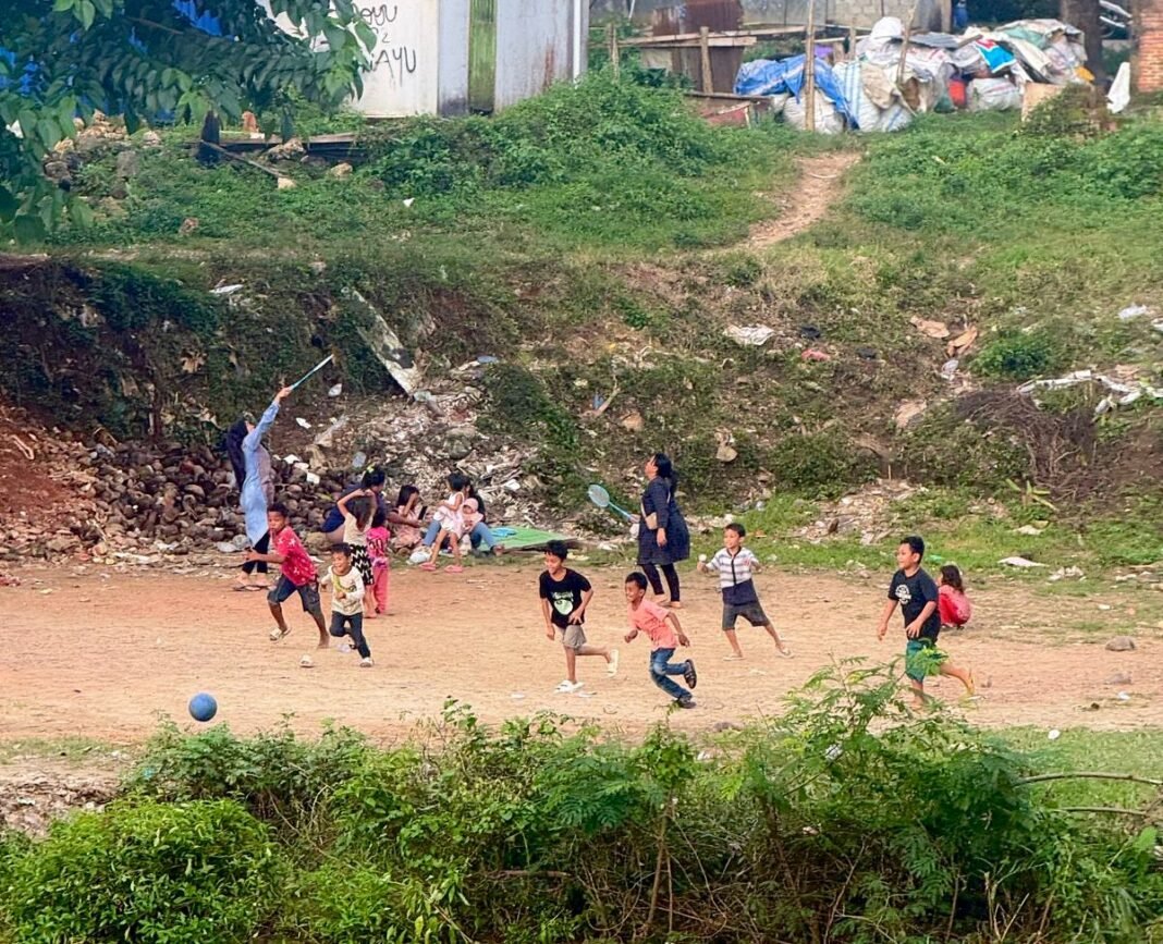 Anak anak itu datang dari rumah rumah padat yang berderet tak jauh dari jembatan. Ada yang mengenakan kaus robek yang sudah lusuh, ada yang bertelanjang kaki, ada pula yang mengenakan celana panjang. Semuanya berbaur, berlari mengejar bola plastik ringan yang sesekali melambung ke luar lapangan, dikejar sambil tertawa cekikikan.