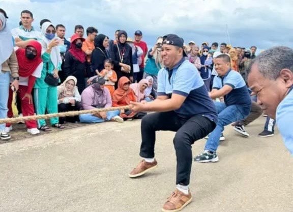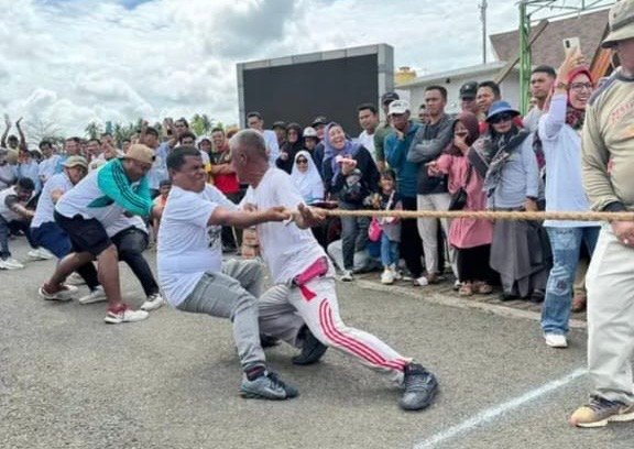 Kemeriahan juga terlihat pada lomba tarik tambang. Dua kelompok saling mengadu kekuatan di tengah sorakan penonton.