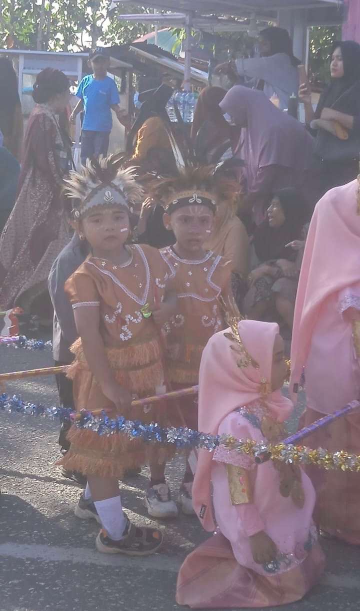 Suasana berbeda hadir saat pawai yang melibatkan anak-anak Taman Kanak-kanak (TK). Dengan pakaian warna-warni, mereka tampil membawa miniatur bendera hingga kostum profesi seperti dokter, polisi, dan prajurit.