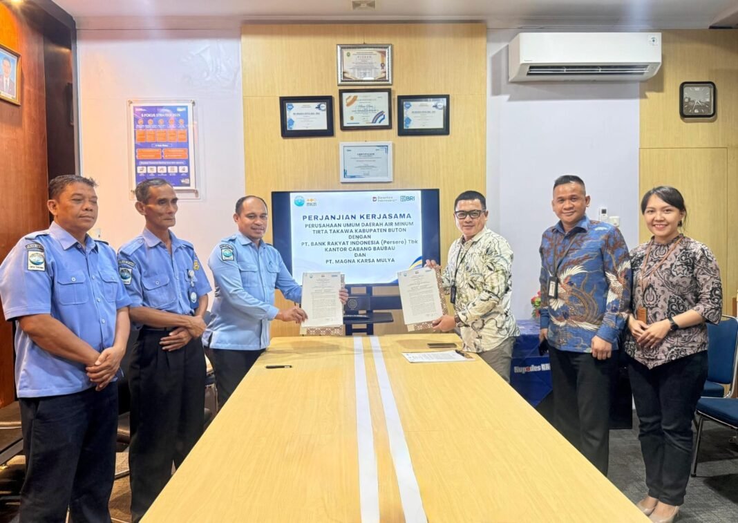 BAUBAU, SEGMENSULTRA.COM – PT Bank Rakyat Indonesia (BRI) Cabang Baubau dan Perusahaan Umum Daerah Air Minum (Perumda) Tirta Takawa Kabupaten Buton menandatangani perjanjian kerjasama untuk meningkatkan kemudahan pembayaran tagihan air secara online.