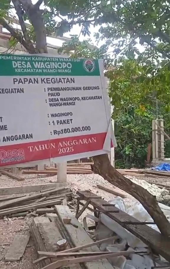 WAKATOBI, SEGMENSULTRA.COM – Proyek pembangunan gedung Pendidikan Anak Usia Dini (PAUD) di Desa Waginopo, Kecamatan Wangi-Wangi Kabupaten Wakatobi, menuai kontroversi terkait penyediaan material. Pasalnya, material pasir yang digunakan dalam pekerjaan itu disebut-sebut berasal dari usaha milik Kepala Desa Longa, La Ode Maskur.