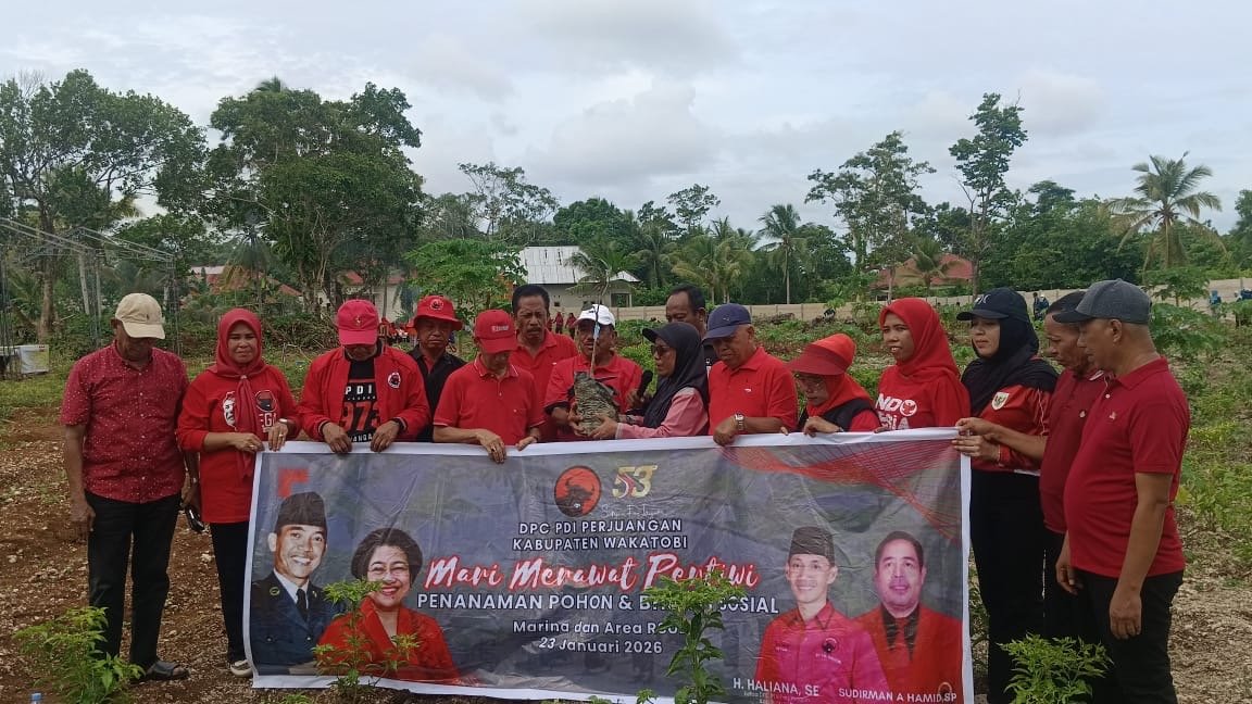 WAKATOBI, SEGMENSULTRA.COM – Dalam rangka memperingati Hari Ulang Tahun ke-78 Ketua Umum DPP PDI Perjuangan, Megawati Soekarnoputri, Dewan Pimpinan Cabang (DPC) PDI Perjuangan Kabupaten Wakatobi menggelar aksi bersih-bersih lingkungan dan penanaman pohon bersama, Jumat (24/01/2026).